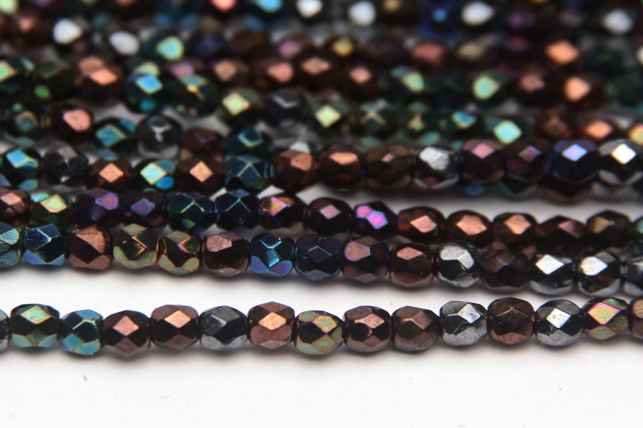 3mm facetted round beads in Black Iris AB. These gorgeous beads, produced in the Czech Republic, are machine cut for extreme precision and made with the highest quality, locally produced glass – 50 beads per strand