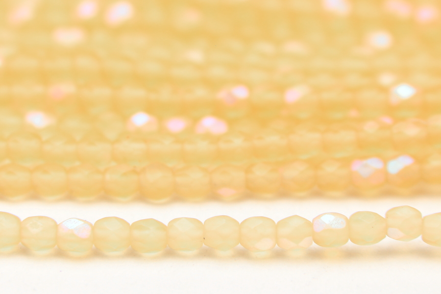 3mm facetted round beads in Frosted Citrus Sorbet AB. These gorgeous beads, produced in the Czech Republic, are machine cut for extreme precision and made with the highest quality, locally produced glass – 50 beads per strand