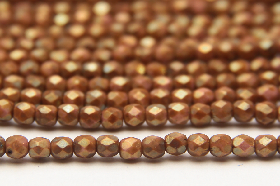 3mm facetted round beads in Gold Lustred Opaque Caramel. These gorgeous beads, produced in the Czech Republic, are machine cut for extreme precision and made with the highest quality, locally produced glass – 50 beads per strand
