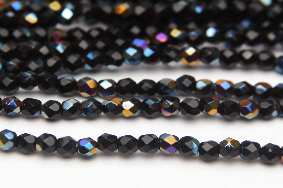 3mm facetted round beads in Jet Rainbow AB. These gorgeous beads, produced in the Czech Republic, are machine cut for extreme precision and made with the highest quality, locally produced glass – 50 beads per strand