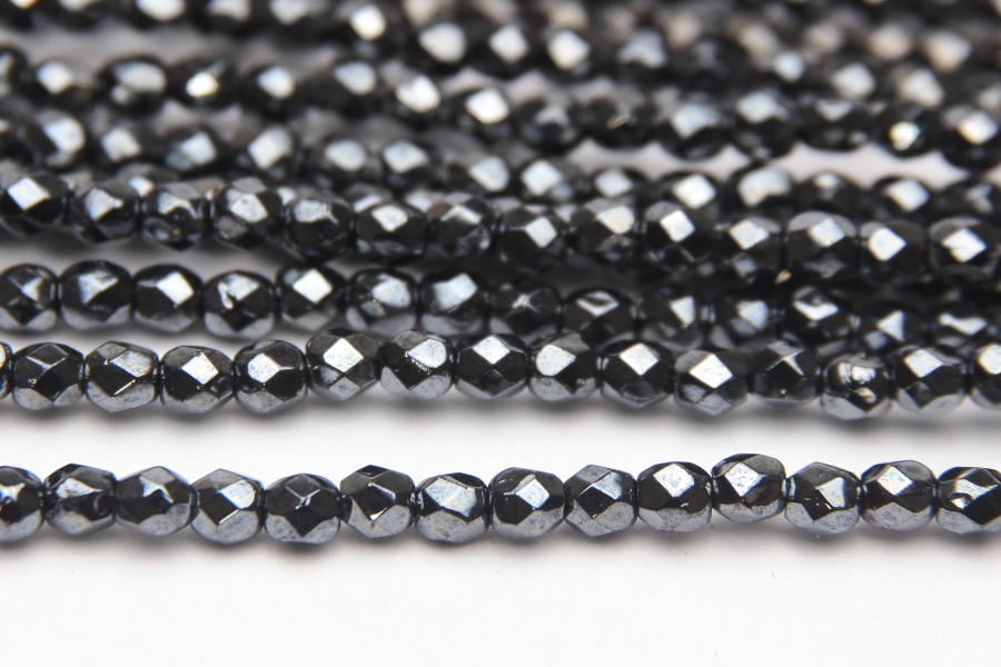 3mm facetted round beads in Metallic Black Mirror. These gorgeous beads, produced in the Czech Republic, are machine cut for extreme precision and made with the highest quality, locally produced glass – 50 beads per strand