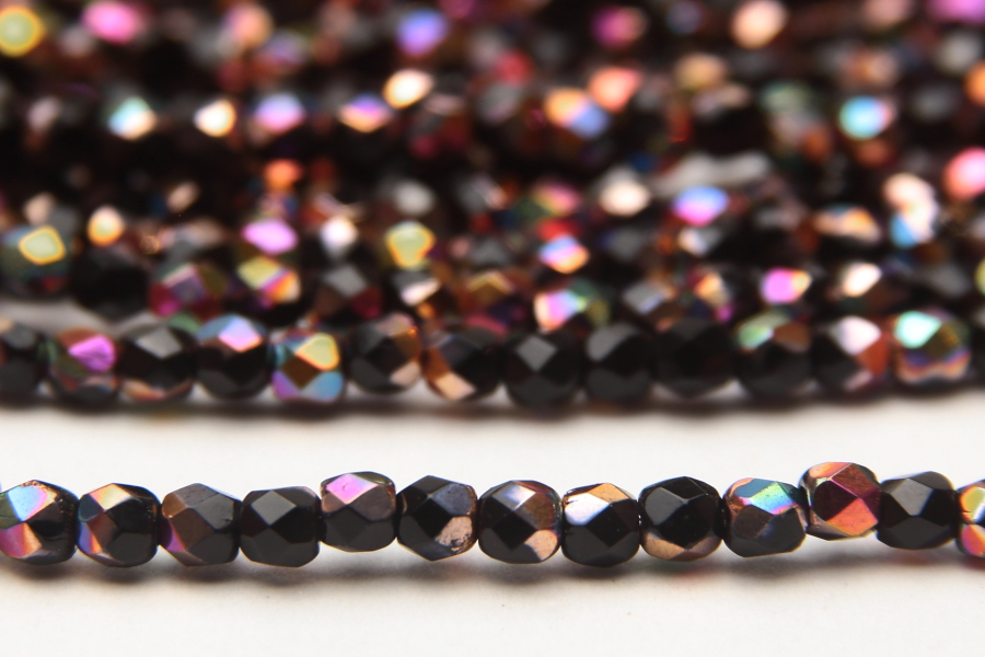 3mm facetted round beads in Metallic Californa Gold Coated Jet. These gorgeous beads, produced in the Czech Republic, are machine cut for extreme precision and made with the highest quality, locally produced glass – 50 beads per strand