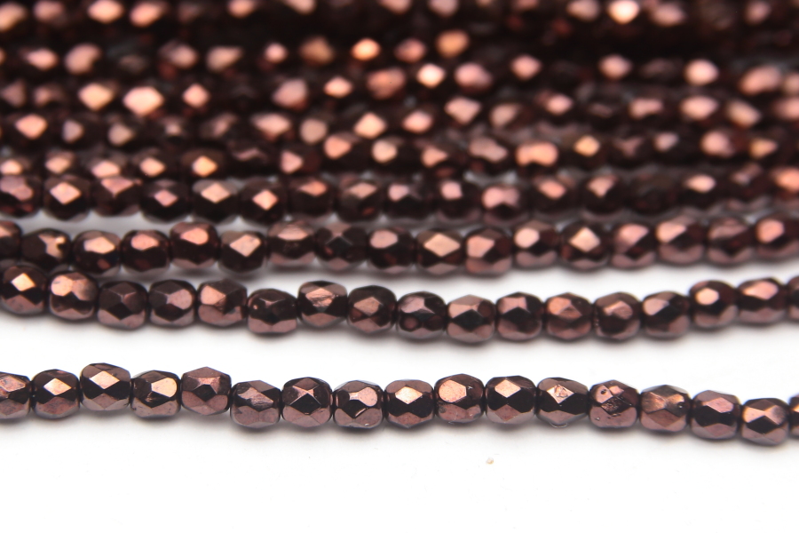 3mm facetted round beads in Metallic Chocolate Copper. These gorgeous beads, produced in the Czech Republic, are machine cut for extreme precision and made with the highest quality, locally produced glass – 50 beads per strand