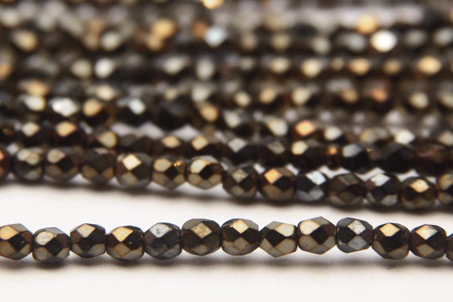3mm facetted round beads in Metallic Deep Ocre. These gorgeous beads, produced in the Czech Republic, are machine cut for extreme precision and made with the highest quality, locally produced glass – 50 beads per strand