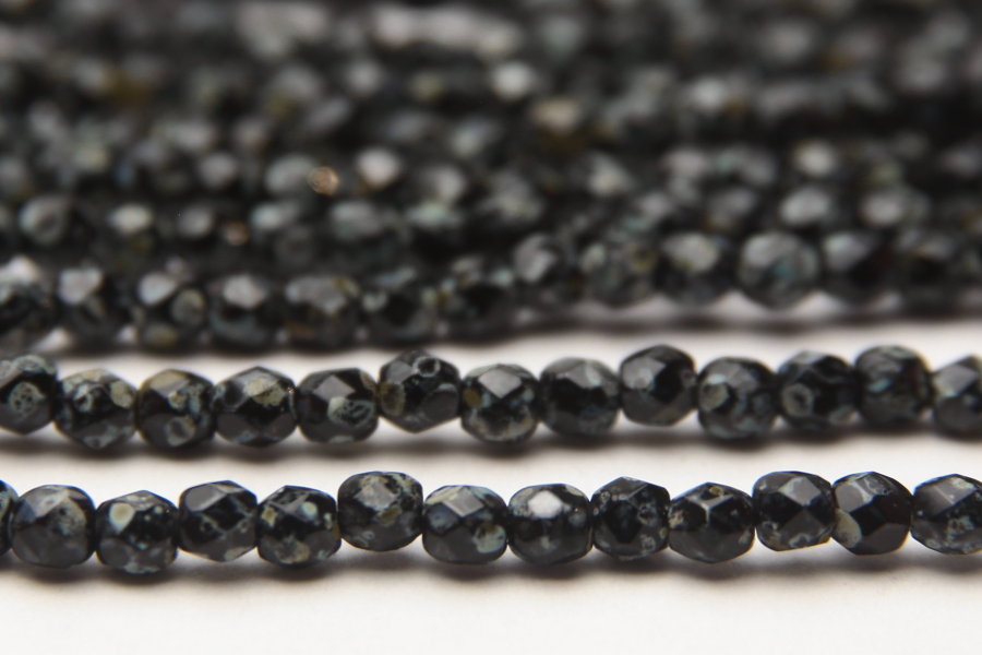 3mm facetted round beads in Metallic Forest. These gorgeous beads, produced in the Czech Republic, are machine cut for extreme precision and made with the highest quality, locally produced glass – 50 beads per strand