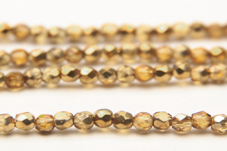 3mm facetted round beads in Metallic Gold Semi Coated Amber. These gorgeous beads, produced in the Czech Republic, are machine cut for extreme precision and made with the highest quality, locally produced glass – 50 beads per strand