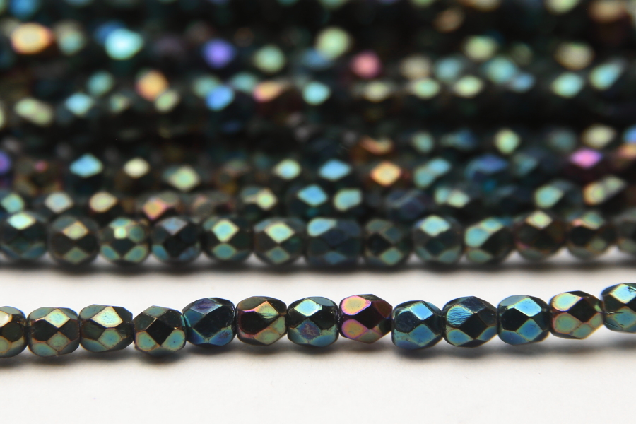 3mm facetted round beads in Metallic Green Iris. These gorgeous beads, produced in the Czech Republic, are machine cut for extreme precision and made with the highest quality, locally produced glass – 50 beads per strand