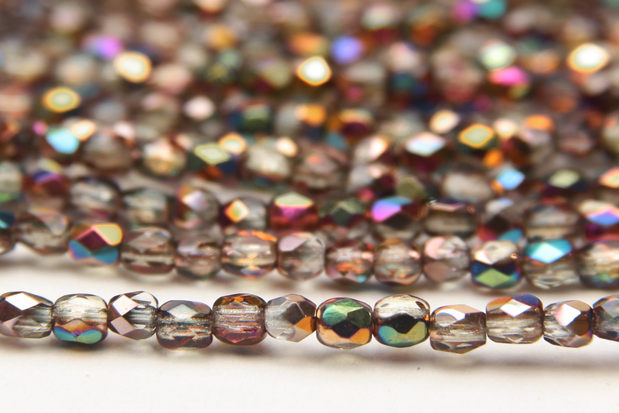 3mm facetted round beads in Metallic Moroccan Bazaar AB. These gorgeous beads, produced in the Czech Republic, are machine cut for extreme precision and made with the highest quality, locally produced glass – 50 beads per strand