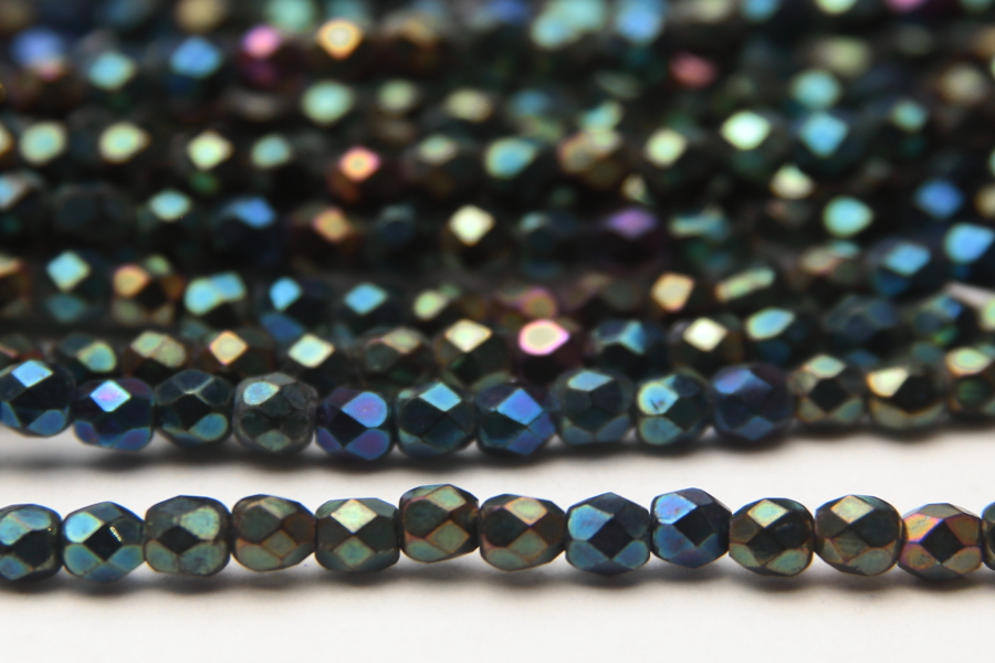 3mm facetted round beads in Semi Matted Metallic Green Iris. These gorgeous beads, produced in the Czech Republic, are machine cut for extreme precision and made with the highest quality, locally produced glass – 50 beads per strand