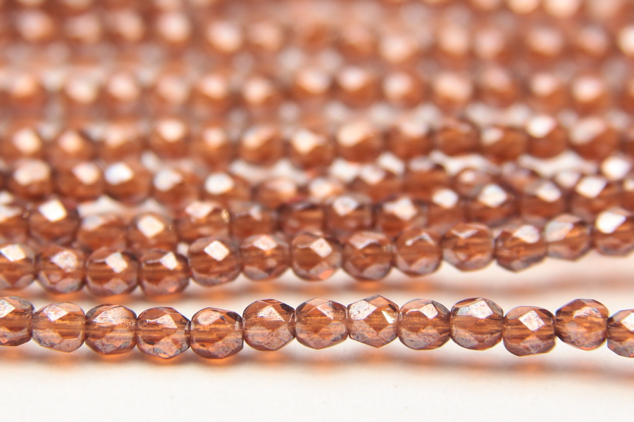 3mm facetted round beads in Transparent Oaken Amber Lustre. These gorgeous beads, produced in the Czech Republic, are machine cut for extreme precision and made with the highest quality, locally produced glass – 50 beads per strand