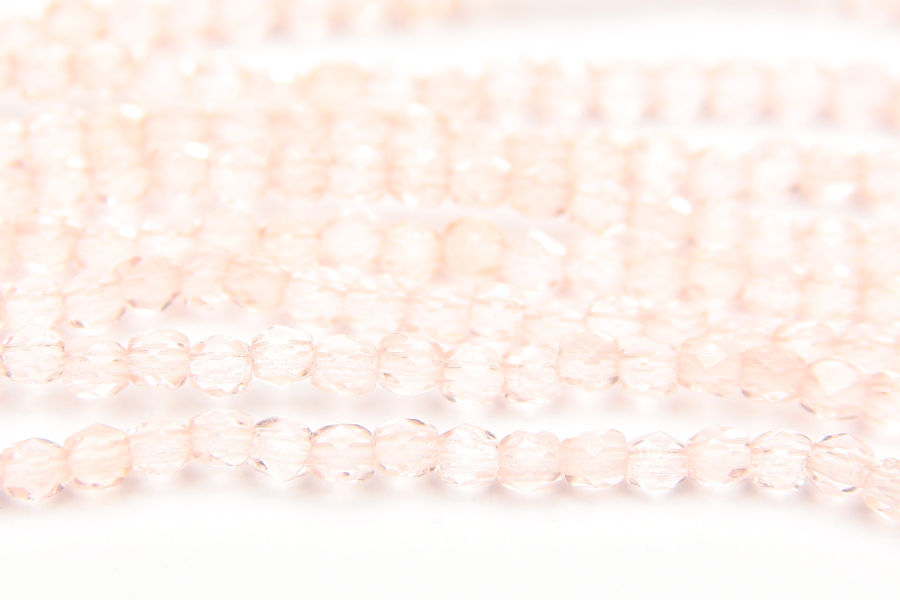 3mm facetted round beads in Transparent Pastel Pink. These gorgeous beads, produced in the Czech Republic, are machine cut for extreme precision and made with the highest quality, locally produced glass – 50 beads per strand