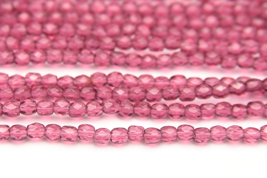 3mm facetted round beads in Transparent Redcurrant Lustre. These gorgeous beads, produced in the Czech Republic, are machine cut for extreme precision and made with the highest quality, locally produced glass – 50 beads per strand