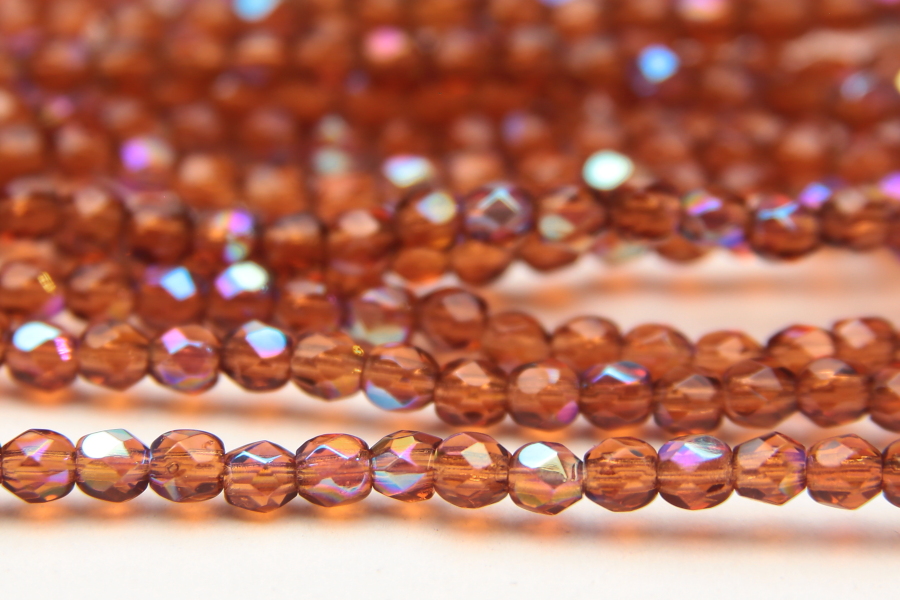 3mm facetted round beads in Transparent Roasted Pumpkin AB. These gorgeous beads, produced in the Czech Republic, are machine cut for extreme precision and made with the highest quality, locally produced glass – 50 beads per strand