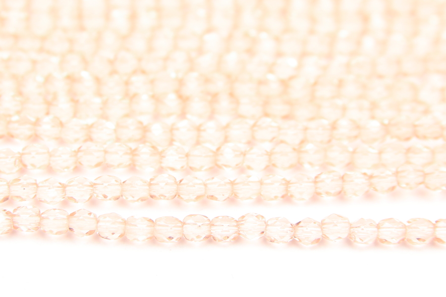 3mm facetted round beads in Transparent Rosaline Lustre. These gorgeous beads, produced in the Czech Republic, are machine cut for extreme precision and made with the highest quality, locally produced glass – 50 beads per strand