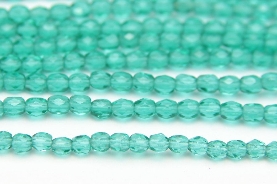 3mm facetted round beads in Transparent Teal Lustre. These gorgeous beads, produced in the Czech Republic, are machine cut for extreme precision and made with the highest quality, locally produced glass – 50 beads per strand