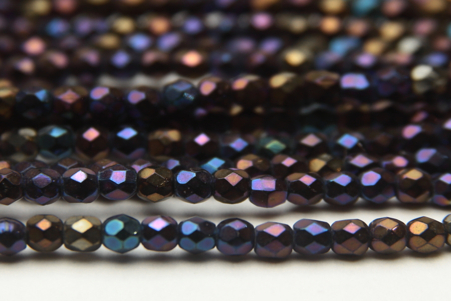 3mm facetted round beads in Metallic Galaxy Purple AB. These gorgeous beads, produced in the Czech Republic, are machine cut for extreme precision and made with the highest quality, locally produced glass – 50 beads per strand
