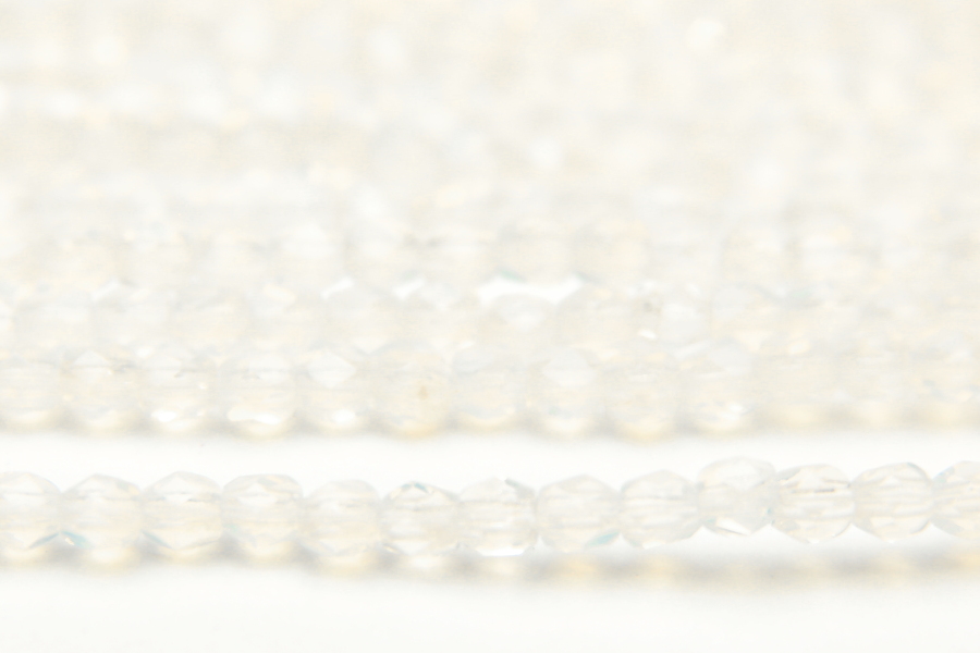 3mm facetted round beads in Milky Crystal Lustre. These gorgeous beads, produced in the Czech Republic, are machine cut for extreme precision and made with the highest quality, locally produced glass – 50 beads per strand