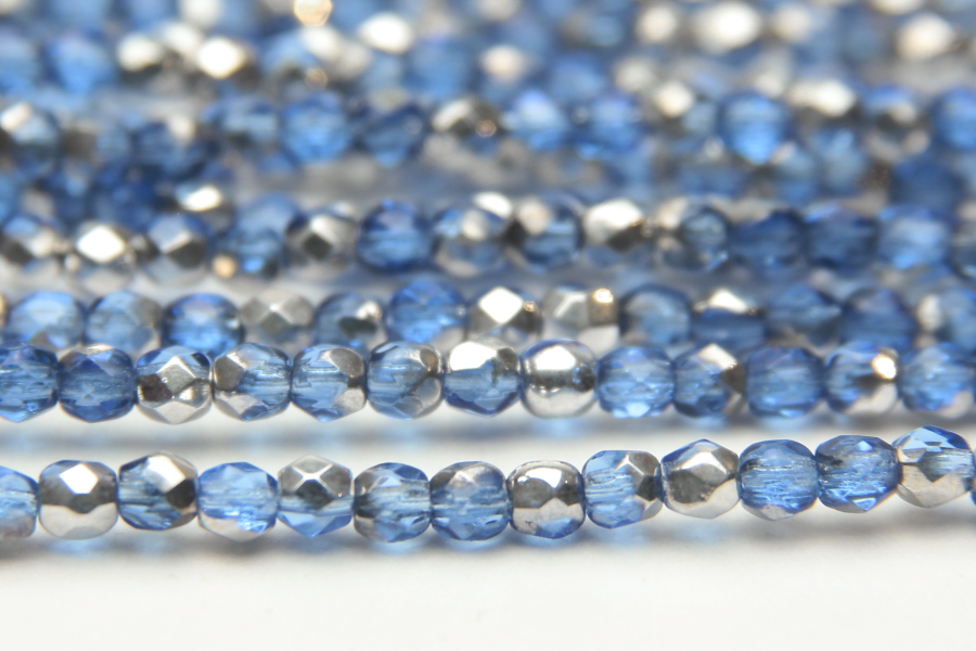 3mm facetted round beads in Metallic Silver Semi Coated Atlantic Blue. These gorgeous beads, produced in the Czech Republic, are machine cut for extreme precision and made with the highest quality, locally produced glass – 50 beads per strand