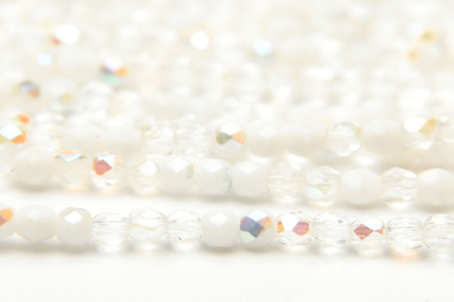 3mm facetted round beads in Opaque Snow and Crystal AB Mix. These gorgeous beads, produced in the Czech Republic, are machine cut for extreme precision and made with the highest quality, locally produced glass – 50 beads per strand