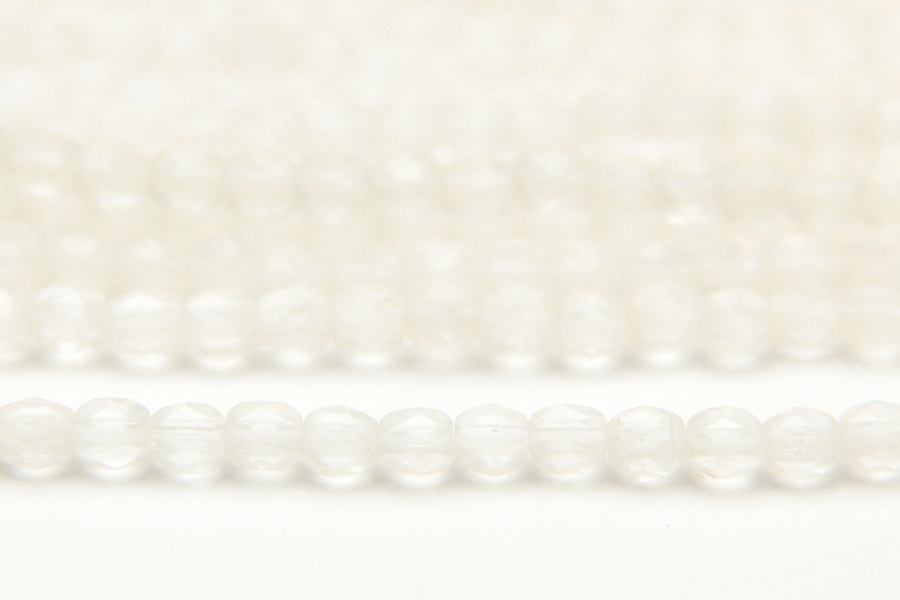3mm facetted round beads in Frosted Crystal Clear. These gorgeous beads, produced in the Czech Republic, are machine cut for extreme precision and made with the highest quality, locally produced glass – 50 beads per strand