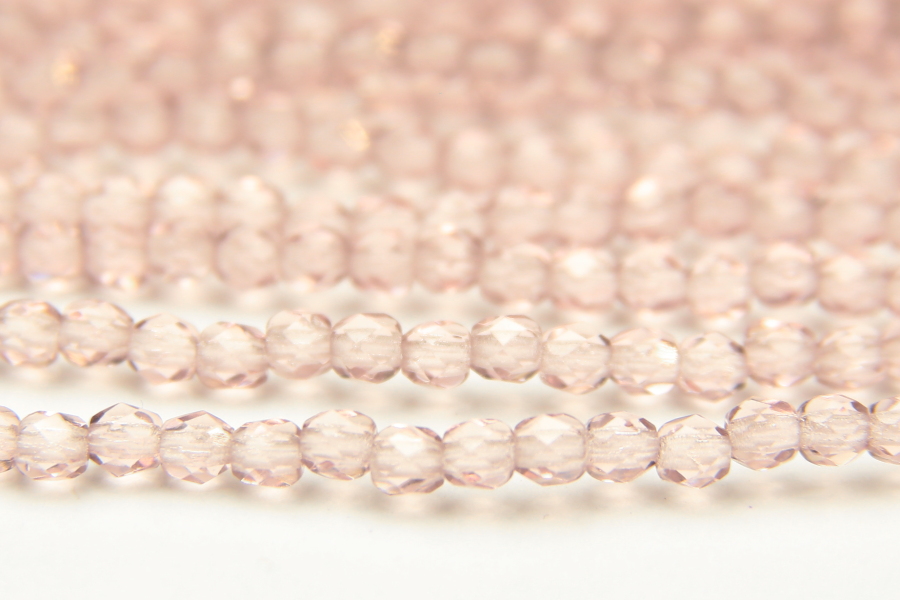 3mm facetted round beads in Transparent Amethyst Lace. These gorgeous beads, produced in the Czech Republic, are machine cut for extreme precision and made with the highest quality, locally produced glass – 50 beads per strand