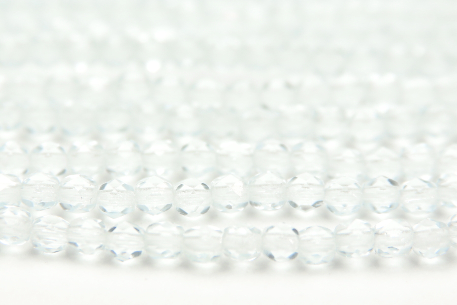 3mm facetted round beads in Transparent Jewel Blue Haze. These gorgeous beads, produced in the Czech Republic, are machine cut for extreme precision and made with the highest quality, locally produced glass – 50 beads per strand