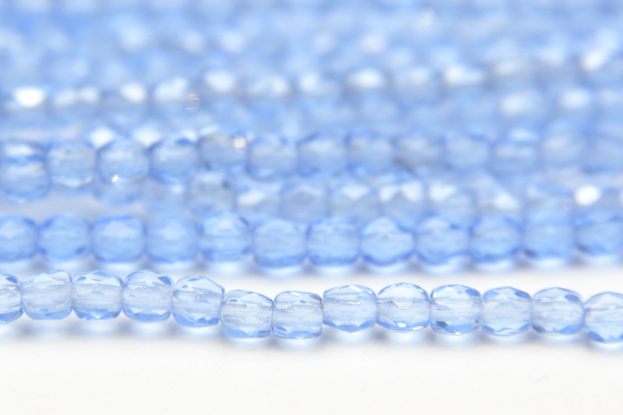 3mm facetted round beads in Transparent Sky Blue. These gorgeous beads, produced in the Czech Republic, are machine cut for extreme precision and made with the highest quality, locally produced glass – 50 beads per strand