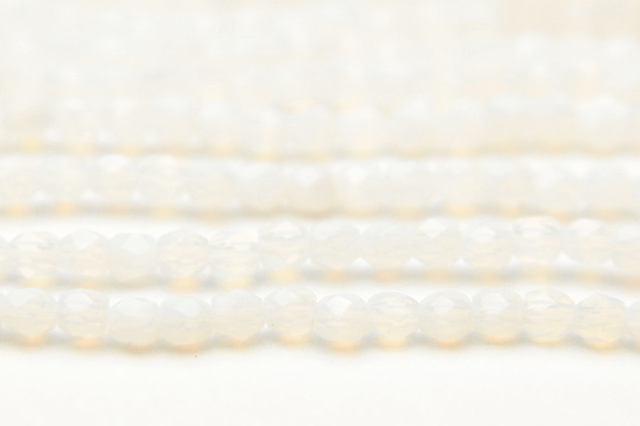 3mm facetted round beads in White Opalite. These gorgeous beads, produced in the Czech Republic, are machine cut for extreme precision and made with the highest quality, locally produced glass – 50 beads per strand