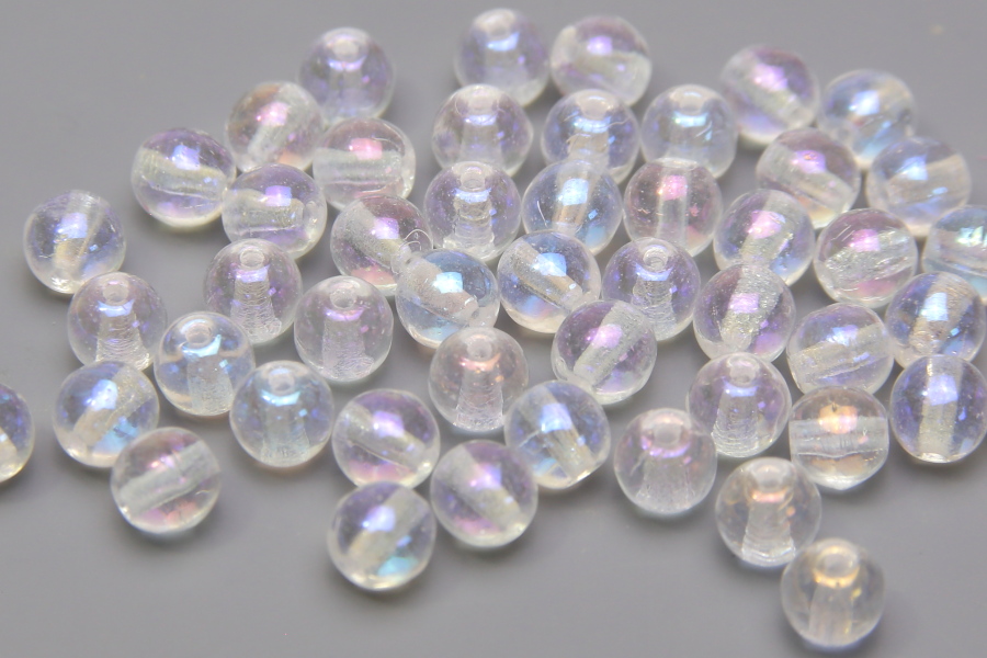 4mm round beads in Crystal AB. These beautiful pressed glass beads, produced in the Czech Republic, are made by hand from the highest quality locally produced glass – 60 beads per pack