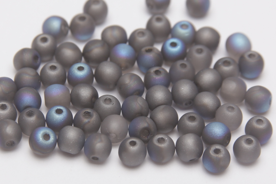4mm round beads in Etched Peweter AB. These beautiful pressed glass beads, produced in the Czech Republic, are made by hand from the highest quality locally produced glass – 60 beads per pack