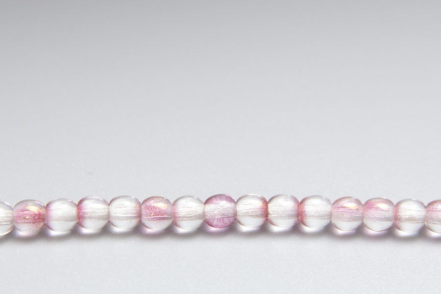 4mm round beads in Hurricane White Lined Cranberry Clear. These beautiful pressed glass beads, produced in the Czech Republic, are made by hand from the highest quality locally produced glass – 60 beads per pack