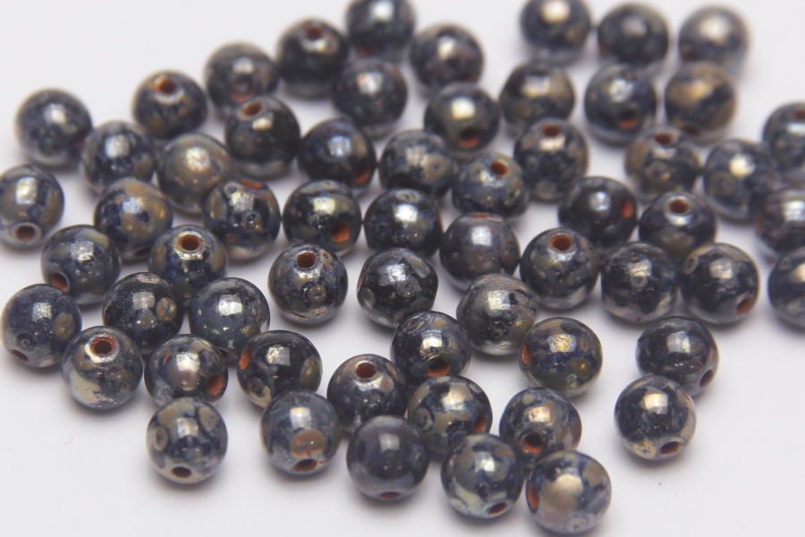 4mm round beads in Picasso Charcoal. These beautiful pressed glass beads, produced in the Czech Republic, are made by hand from the highest quality locally produced glass – 60 beads per pack