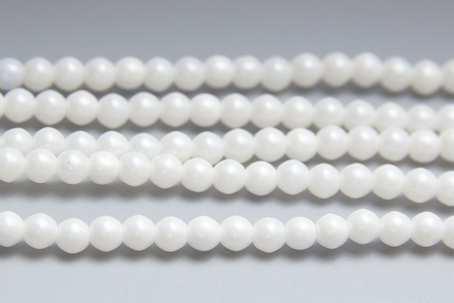 4mm round beads in Satin White Pearl. These beautiful pressed glass beads, produced in the Czech Republic, are made by hand from the highest quality locally produced glass – 60 beads per pack