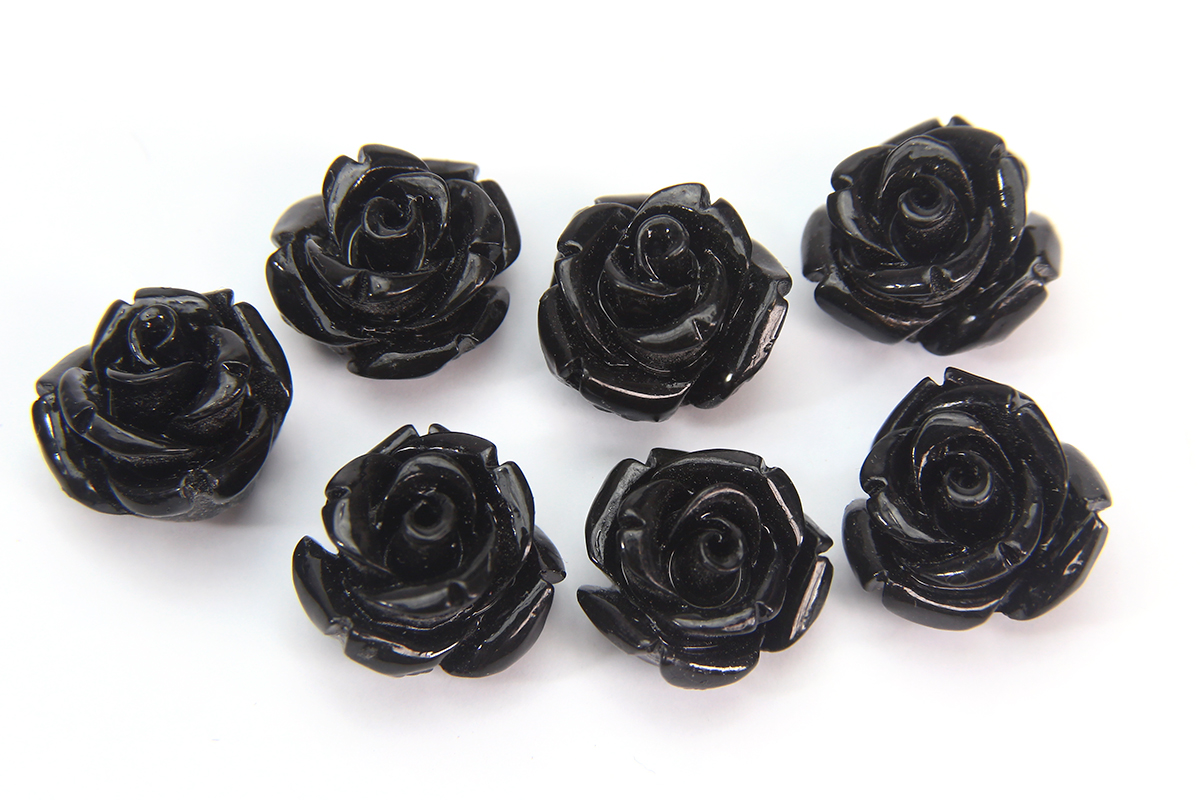 Each of these 12mm Black Rose beads are molded from an alabaster and shell composite then individually hand finished to have pristine edges and details. The Alabaster provides each bead with both durability and a luxurious feel with the shell providing a lusterous appearance and slight translucence as though each gemstone flower has its own gentle inner glow. Each packet contains 7 beads.