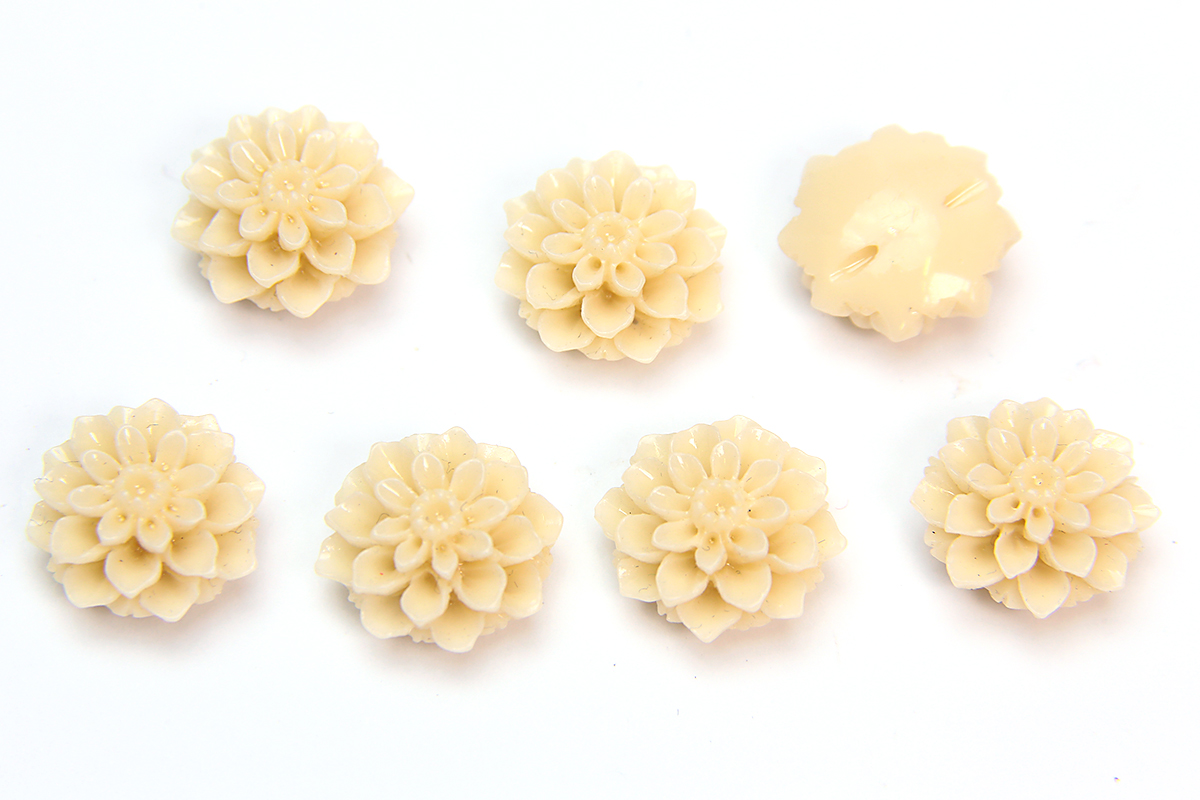 Each of these 15mm Cream Chrysanthemum beads are molded from an alabaster and shell composite then individually hand finished to have pristine edges and details. The Alabaster provides each bead with both durability and a luxurious feel with the shell providing a lusterous appearance and slight translucence as though each gemstone flower has its own gentle inner glow. Each packet contains 7 beads.