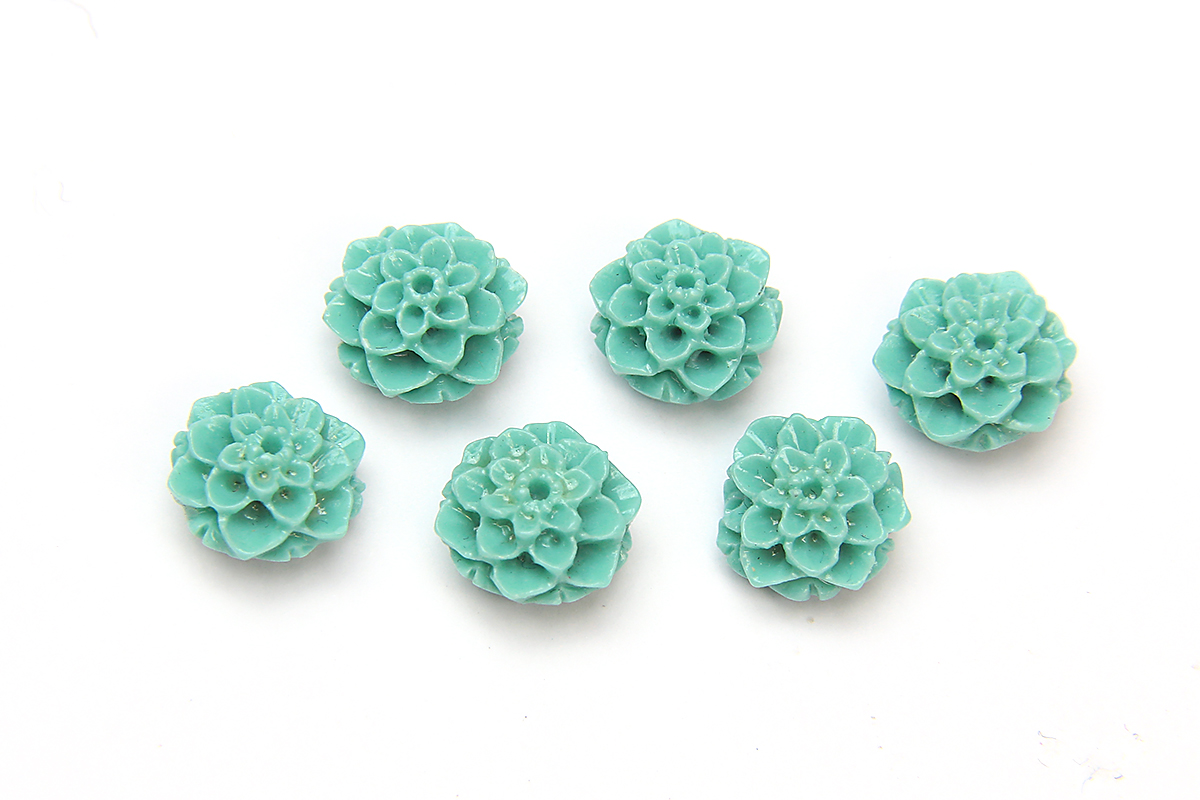 Each of these 8mm Turquoise Chrysanthemum beads are molded from an alabaster and shell composite then individually hand finished to have pristine edges and details. The Alabaster provides each bead with both durability and a luxurious feel with the shell providing a lusterous appearance and slight translucence as though each gemstone flower has its own gentle inner glow. Each packet contains 6 beads.