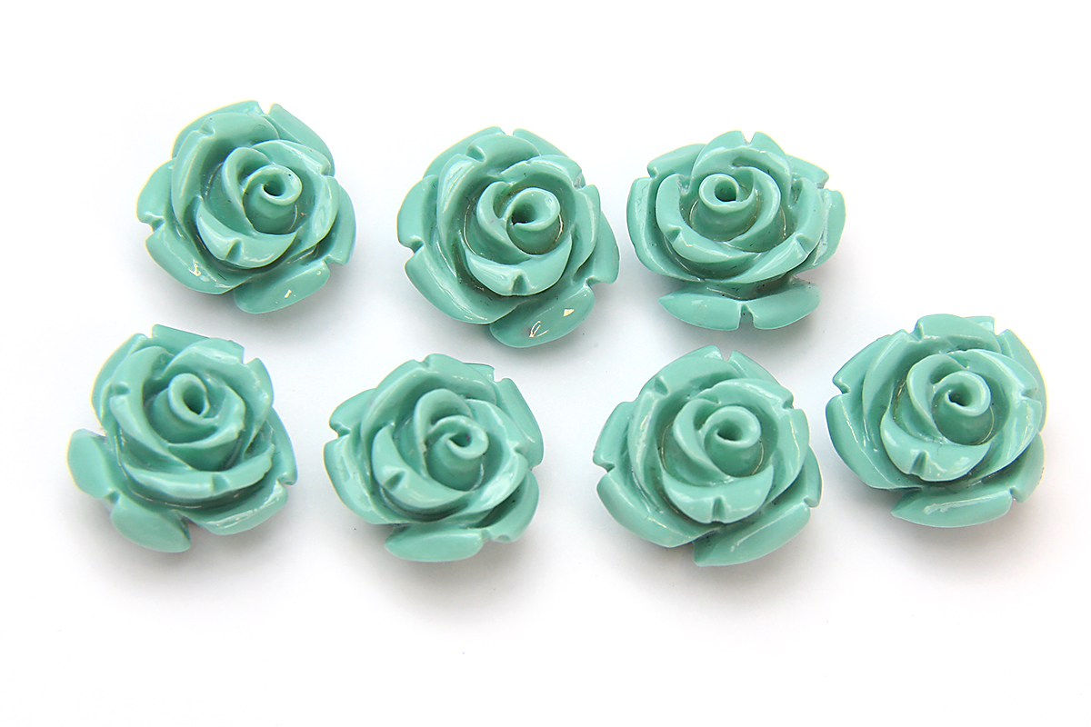 Each of these 12mm Turquoise Rose beads are molded from an alabaster and shell composite then individually hand finished to have pristine edges and details. The Alabaster provides each bead with both durability and a luxurious feel with the shell providing a lusterous appearance and slight translucence as though each gemstone flower has its own gentle inner glow. Each packet contains 6 beads.
