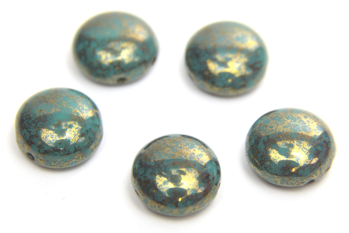 Turquoise Gold Picasso 12mm 2-HolePreciosa Candy Beads, 5 pieces