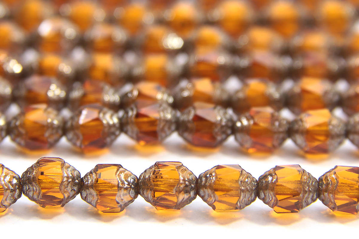 6x7mm Amber Firepolish, Gunmetal Crowned Czech Bols, 10 beads