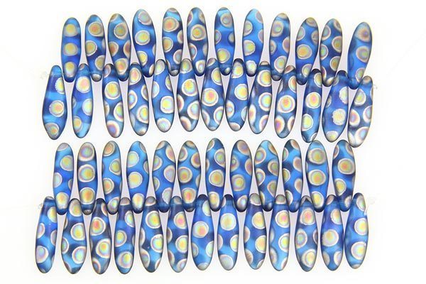 A fun strand of Dichroic Frosted Blue Daggers made from the highest quality pressed Czech glass. These beads are great for use as flower petals in floral designs or as long focal drops in necklaces. Great fun to use in your beadweaving designs.