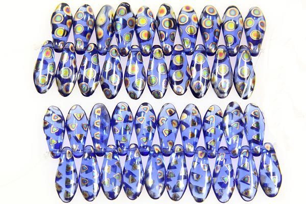 A fun strand of Dichroic Lustre Blue Daggers made from the highest quality pressed Czech glass. These beads are great for use as flower petals in floral designs or as long focal drops in necklaces. Great fun to use in your beadweaving designs.