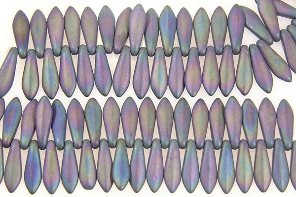 A fun strand of Lt Peacock Frosted Daggers made from the highest quality pressed Czech glass. These beads are great for use as flower petals in floral designs or as long focal drops in necklaces. Great fun to use in your beadweaving designs.