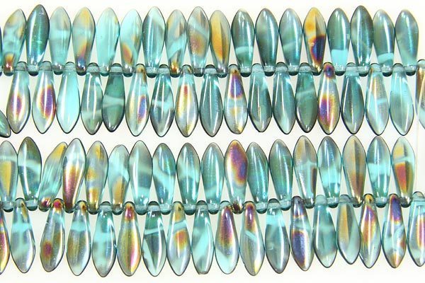A fun strand of Teal AB Daggers made from the highest quality pressed Czech glass. These beads are great for use as flower petals in floral designs or as long focal drops in necklaces. Great fun to use in your beadweaving designs.