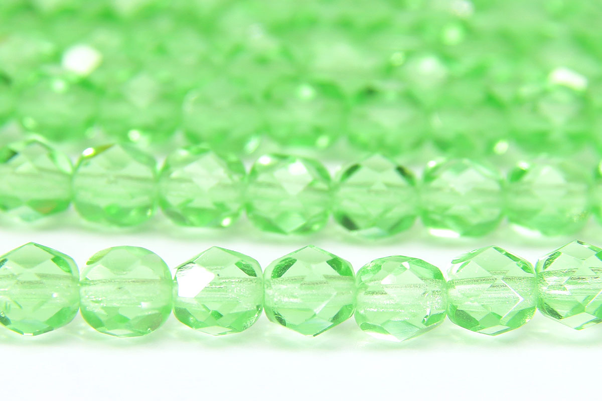 6mm facetted round beads in Lustre Parrot Green. These gorgeous beads, produced in the Czech Republic, are machine cut for extreme precision and made with the highest quality, locally produced glass – 25 beads per pack