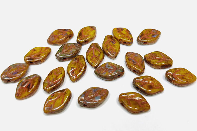 12x7mm Picasso Autumn Brown Top Drilled Leaf made from high quality pressed Czech glass. Each bead is moulded to include a leaf stem structure for added texture. Coming in a pack of 20 beads, these gorgeous beads are perfect for floral designs or nature themed designs