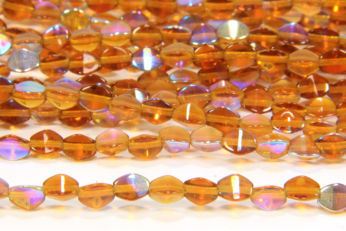 A 38 bead strand of high quality Czech pressed glass Amber AB Coated Pinch Beads. With 3 flat surfaces to catch the light that are tapered at each end to give a barrel like appearance, these beautiful beads are perfect G8 adding some interesting texture to your designs in an understated way. Semi transparent glass