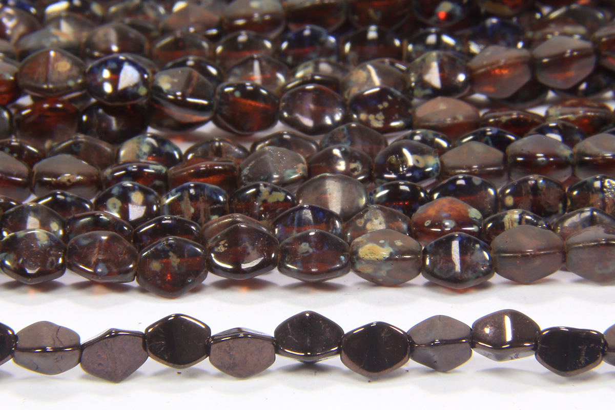 A 38 bead strand of high quality Czech pressed glass Chestnut Pinch Beads. With 3 flat surfaces to catch the light that are tapered at each end to give a barrel like appearance, these beautiful beads are perfect G8 adding some interesting texture to your designs in an understated way. Semi transparent glass