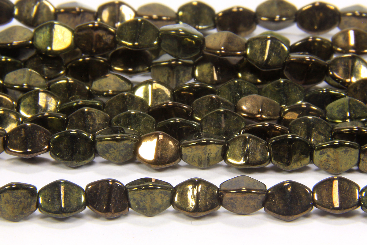 A 38 bead strand of high quality Czech pressed glass Golden Umber Pinch Beads. With 3 flat surfaces to catch the light that are tapered at each end to give a barrel like appearance, these beautiful beads are perfect G8 adding some interesting texture to your designs in an understated way. Opaque gold lustre glass