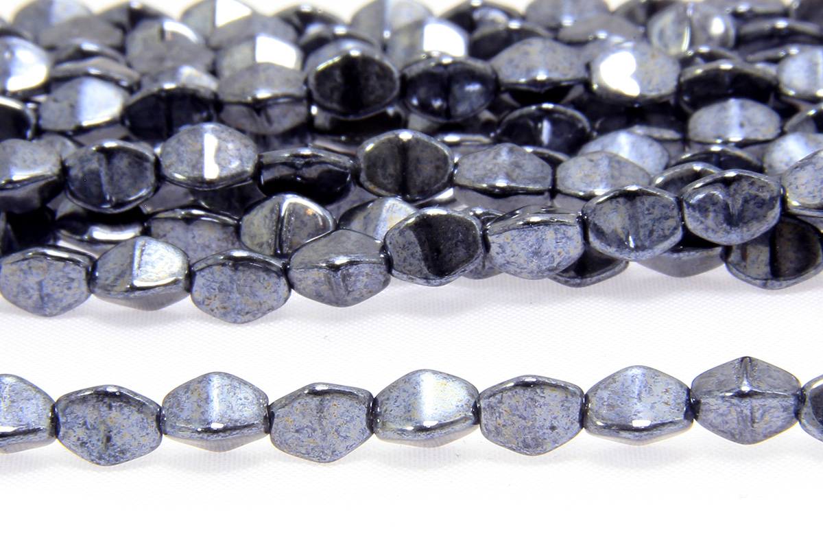 A 38 bead strand of high quality Czech pressed glass Hematite Coloured Pinch Beads. With 3 flat surfaces to catch the light that are tapered at each end to give a barrel like appearance, these beautiful beads are perfect G8 adding some interesting texture to your designs in an understated way. Clear class, half Silvered. Perfect for your monochromatic jewellery.
