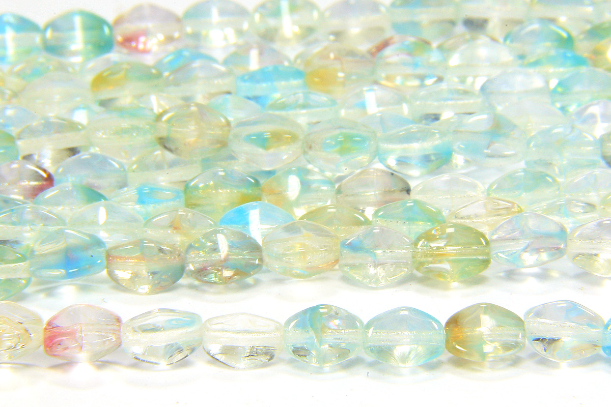 A 38 bead strand of high quality Czech pressed glass Lakeside, Greens and Blues, Pinch Beads. With 3 flat surfaces to catch the light that are tapered at each end to give a barrel like appearance, these beautiful beads are perfect G8 adding some interesting texture to your designs in an understated way. Lustre coated glass